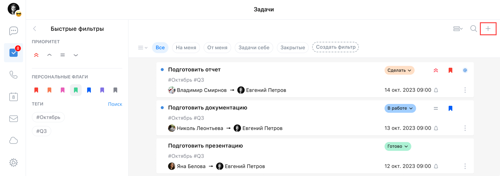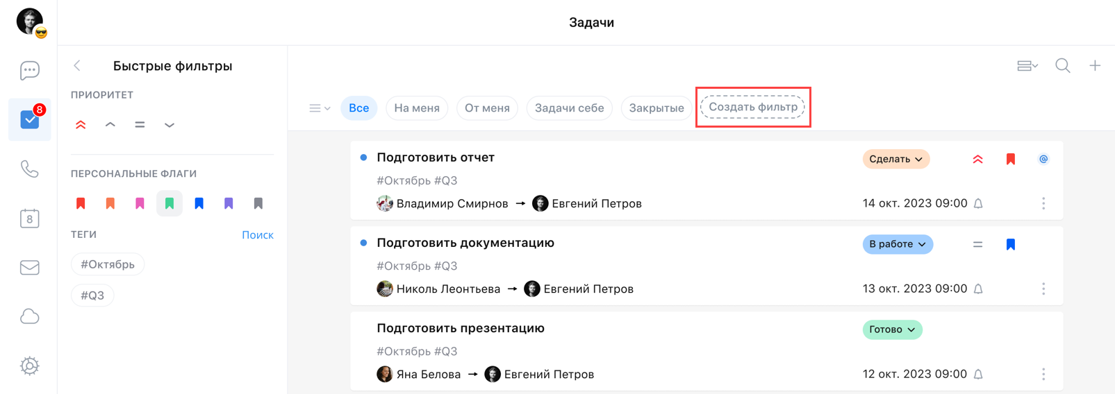 Для работы с быстрыми фильтрами выберите необходимые флаги, приоритеты, теги и/или другие атрибуты задачи: