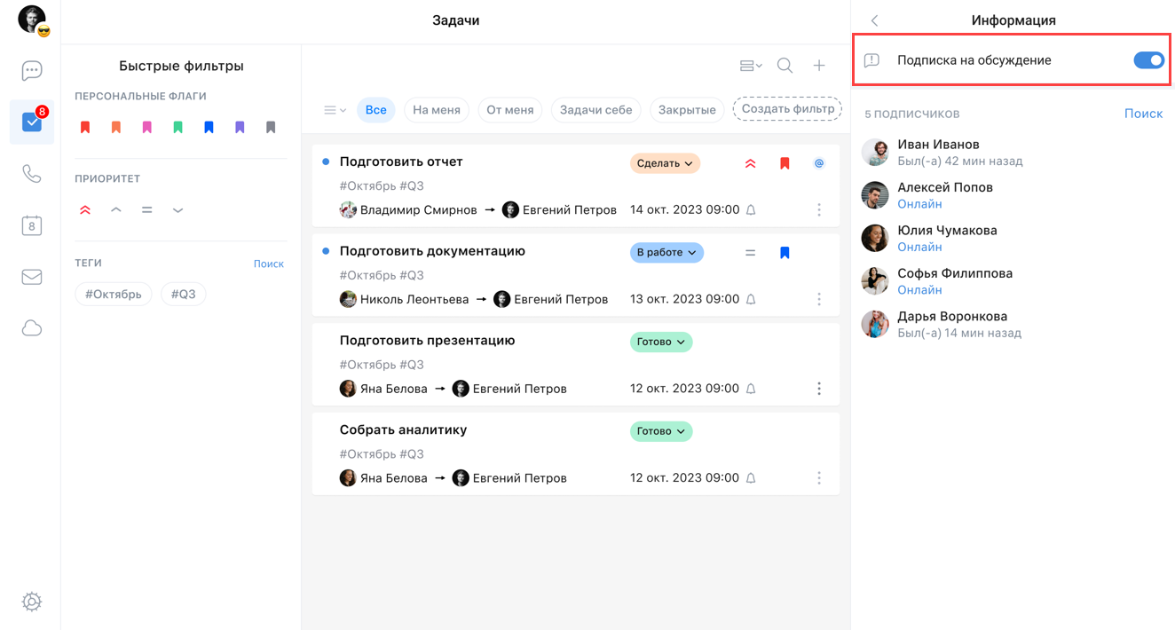 Чтобы прекратить наблюдение за задачей или отписаться от обсуждения задачи, перейдите в задачу, нажмите на иконку в правом верхнем углу. Далее выключите переключатель Подписка на обсуждение: