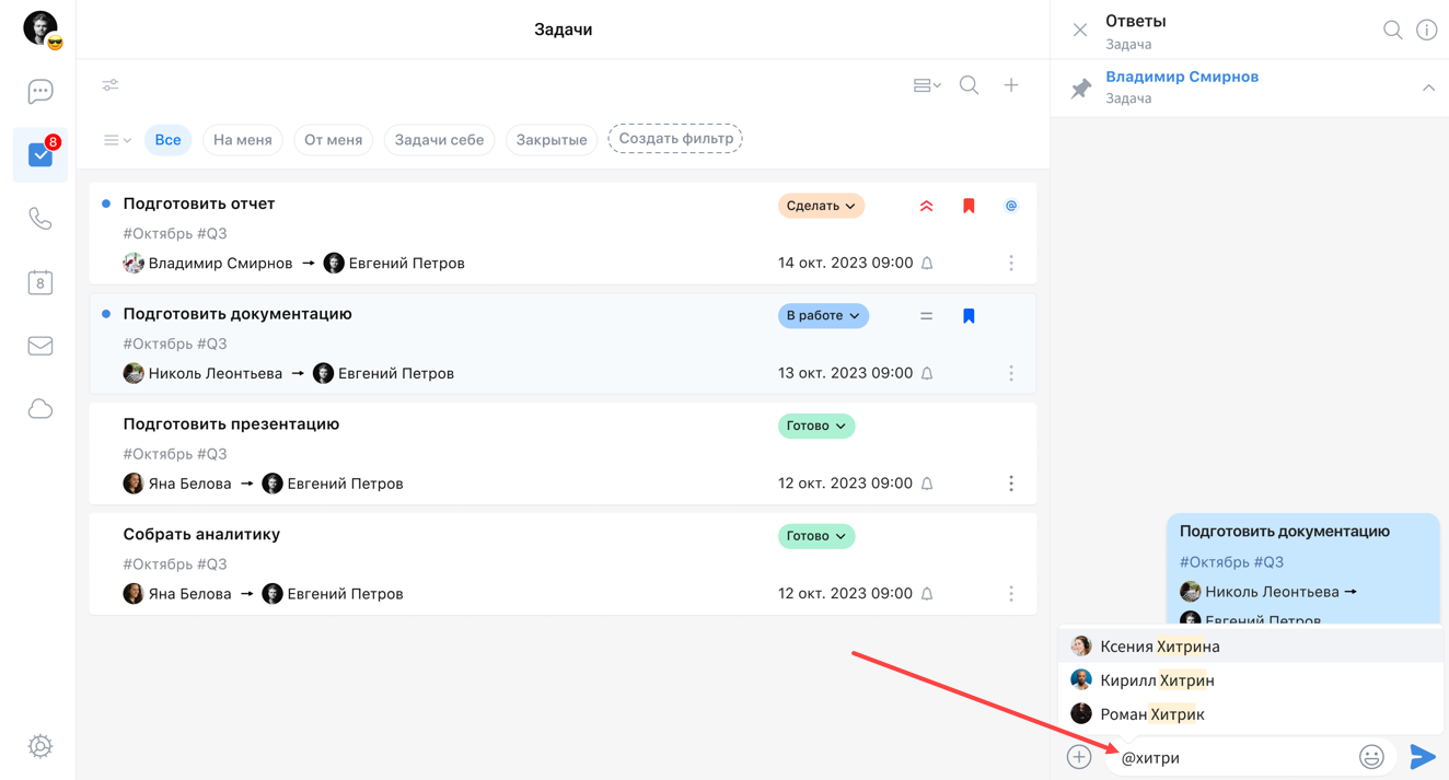 Чтобы предоставить другому пользователю возможность просматривать задачу и обсуждать ее, начните вводить @имя_пользователя в строку ввода сообщения, выберите пользователя и нажмите на клавишу Enter: