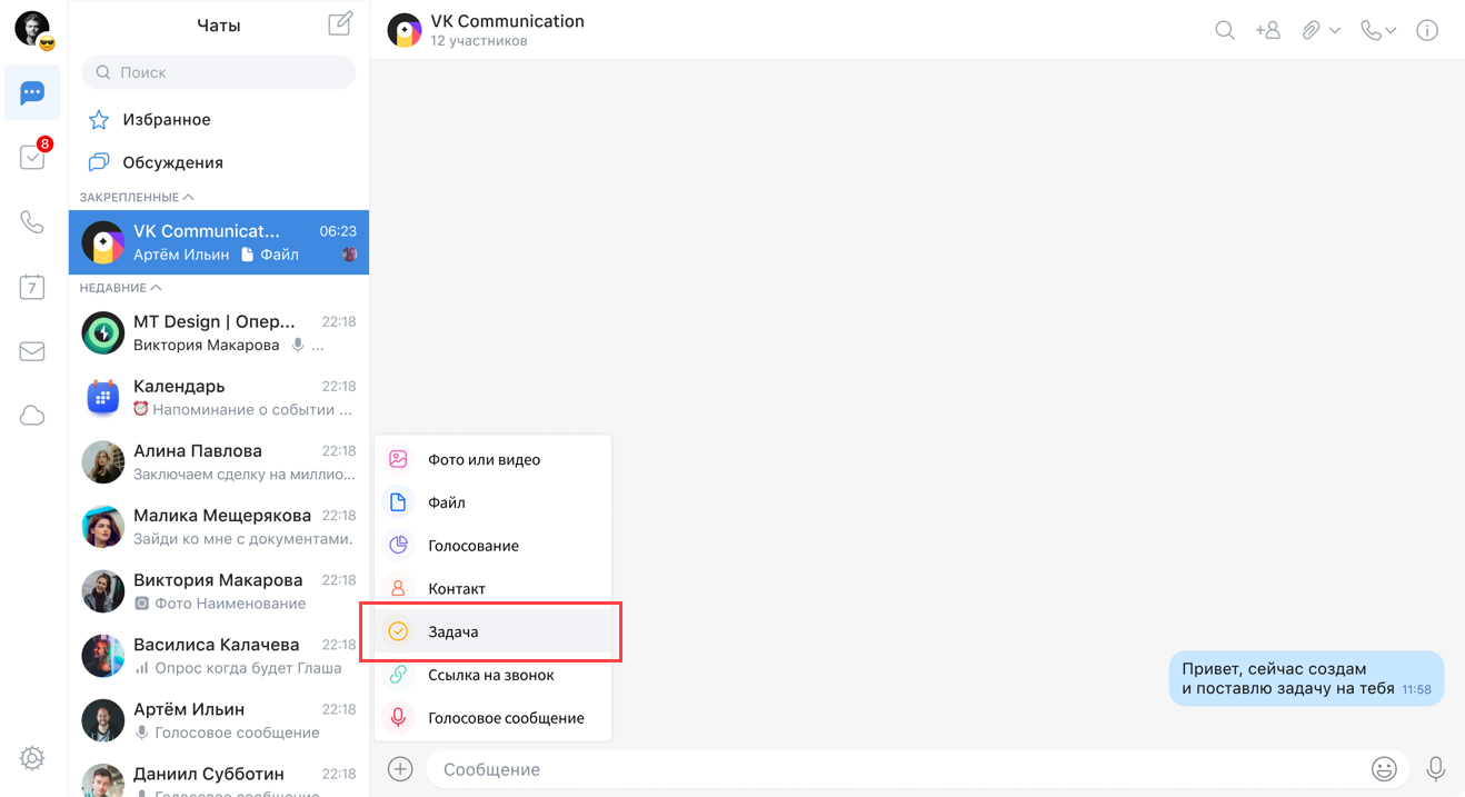 или найдите необходимую задачу в чате — перейдите в чат, нажмите на иконку и укажите наименование задачи.