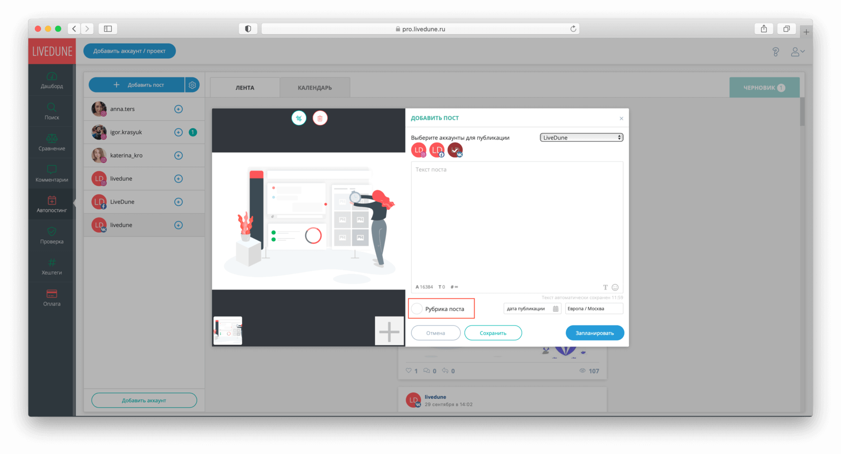 Важно: Livedune работает через официальное API Инстаграм. Оно разрешает управлять учетными записями через это приложение. Метод полностью белый, правда, возможности автопостинга в официальном API пока нет