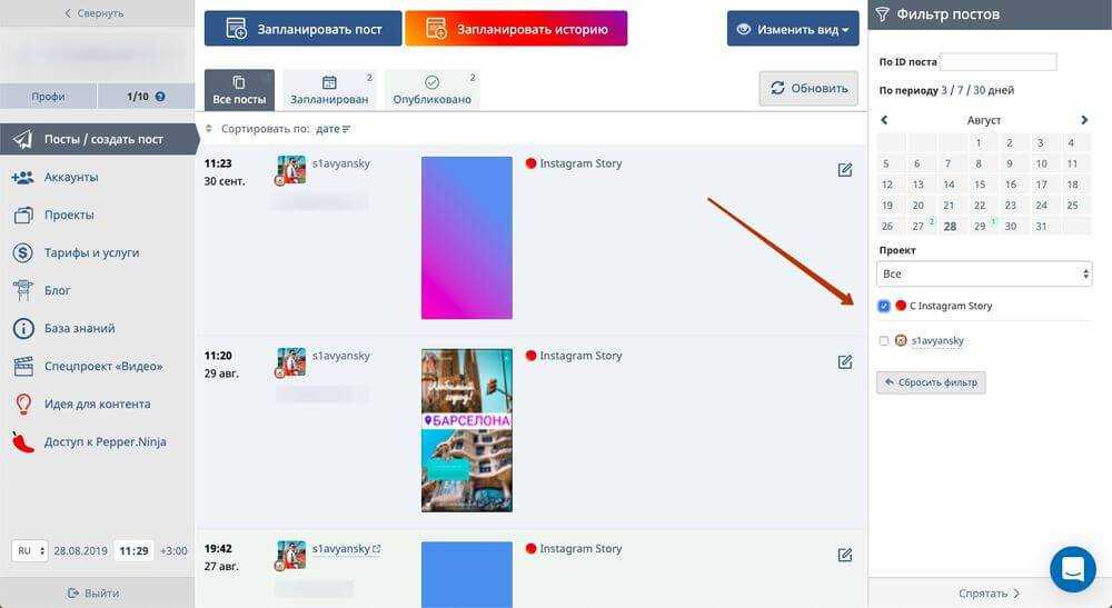 Площадка с приятным интерфейсом и понятным планировщиком постов и сториз. Предусмотрен календарь для удобного планирования, статистика, автоудаление, фоторедактор. Платформа предоставляет 7 дней тестового периода, затем оплата будет составлять от 249 руб./мес.