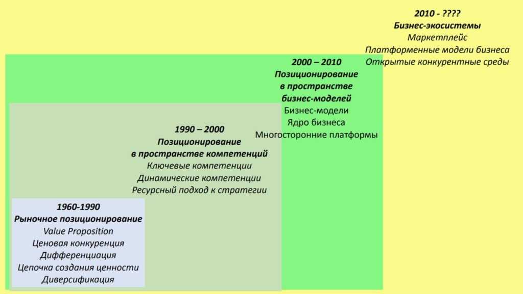 Наблюдая за этой динамикой, мы видим, что следующий этап не отрицает предыдущий, просто предыдущий этап нужно рассматривать в новом контексте. Например, задача рыночного позиционирования не исчезла, но теперь ее нужно решать в контексте бизнес-экосистем, и это уже другие методы.