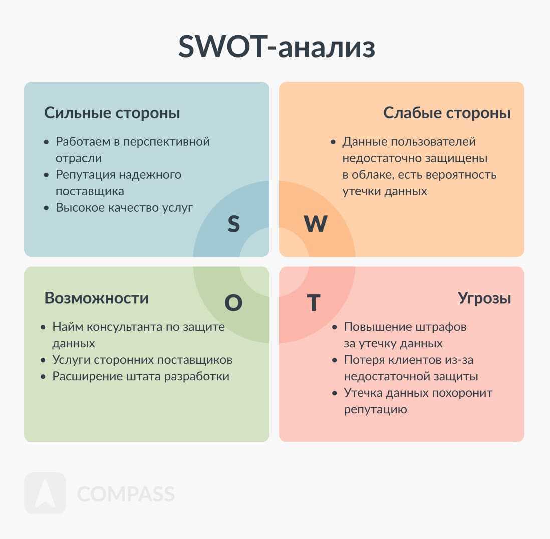 В этом поможет матрица SWOT-анализа, с помощью которой изучают четыре фактора: