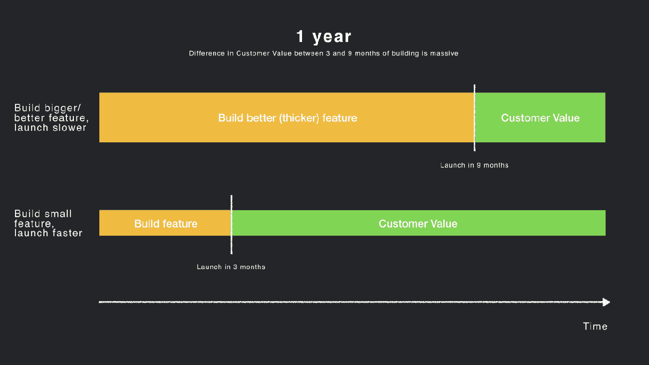 Когда вы определяете первую версию своего продукта, вы накапливаете всевозможные удивительные функции, которые вы мечтаете добавить позже в будущих версиях. Помните, что они могут никогда не выйти, потому что вы никогда не знаете, что может случиться: изменится продуктовая стратегия компании, ваш ведущий инженер уволится или вся команда будет переведена на другие проекты.