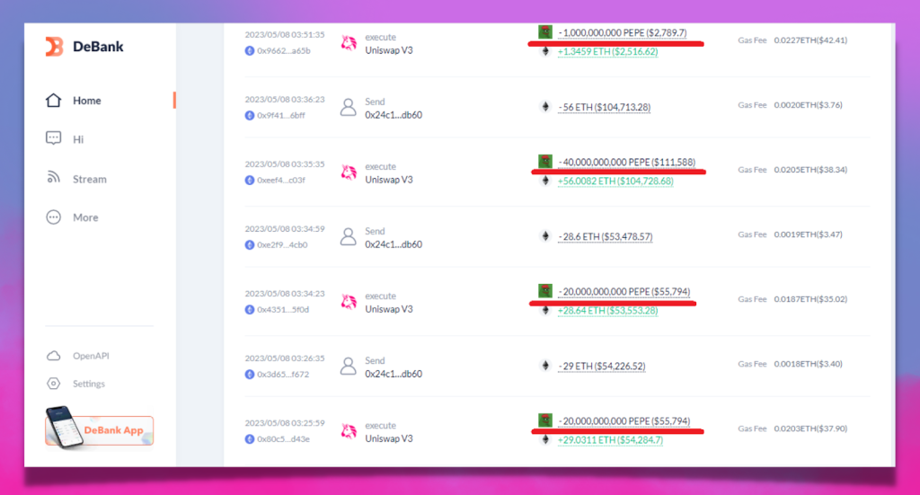 Пример транзакций владельца второго кошелька по обмену PEPE на ETH (сервис DeBank)