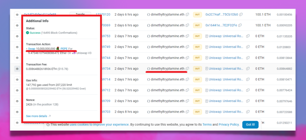 Пример одной из транзакций владельца кошелька по обмену PEPE на ETH