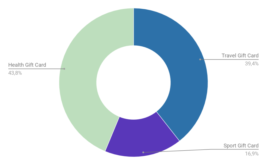 На диаграмме ниже представлено, как распределились доли среди виртуальных бенефит-карт в кейсе одного из заказчиков. Подарочная карта для отдыха и карта здоровья стали самыми выбираемыми в кафетерии льгот.