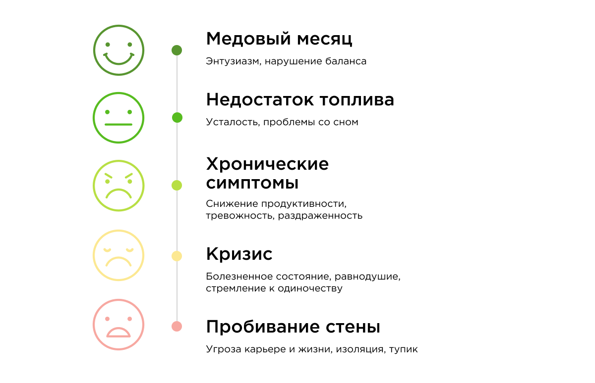 - «Медовый месяц». Человек с повышенным энтузиазмом берется за любые задачи, сдает проект за проектом, с горящими глазами рассказывает о задачах. Работа радует его, мотивирует и дает топливо.