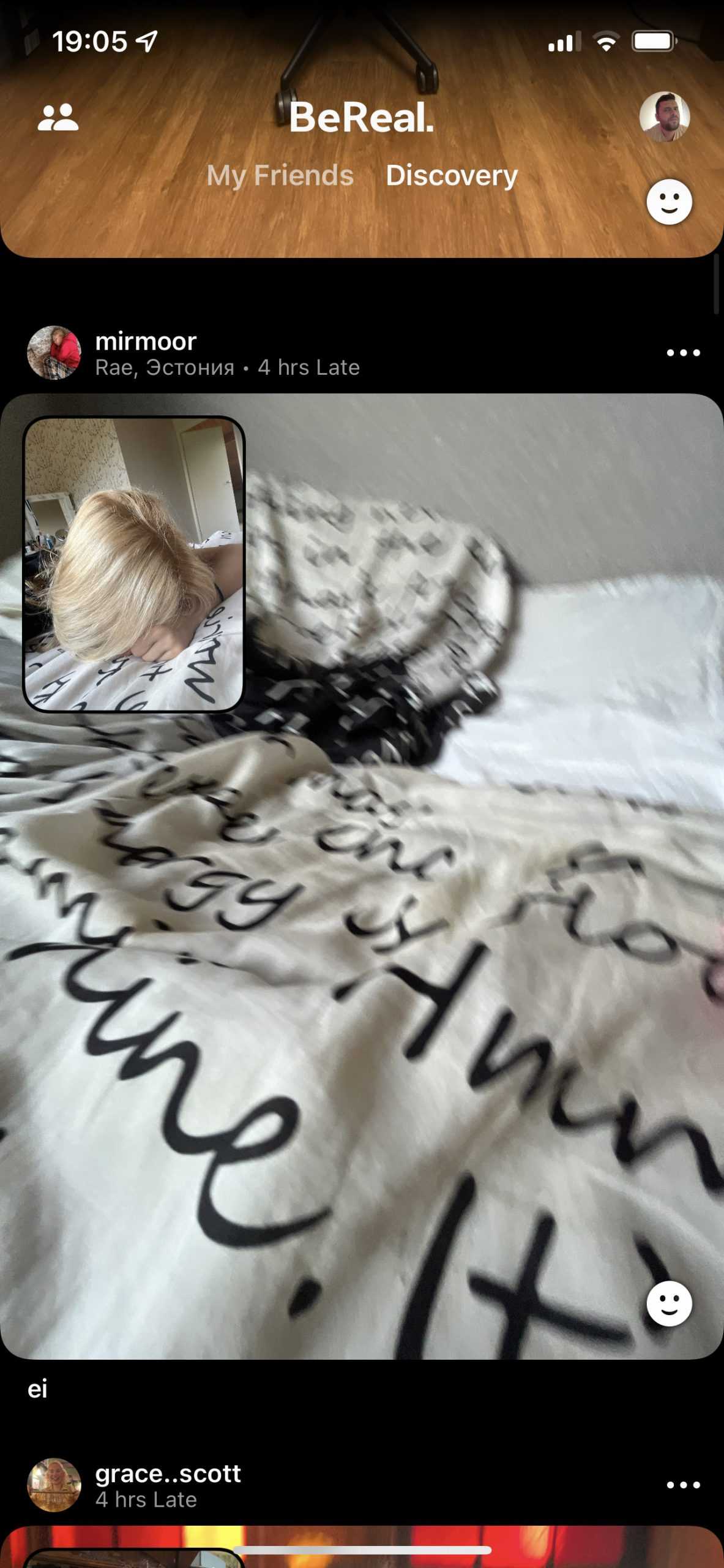 В BeReal можно смотреть ленту своих подписок или всемирную ленту, в которую попадают посты с общей видимостью. Это вообще странная тема: ты смотришь случайные фотографии незнакомых людей со всего мира. Многие сделаны так, как будто телефон в кармане что-то сфотографировал и по ошибке опубликовалось.