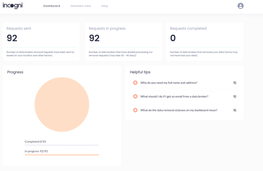 Поскольку вы оплатили свою подписку, они немедленно свяжутся с брокерами данных и потребуют от них удалить ваше имя и информацию из своих баз данных (если она там зарегистрирована). Этот процесс происходит автоматически, и вы можете следить за процессом на панели инструментов на платформе.