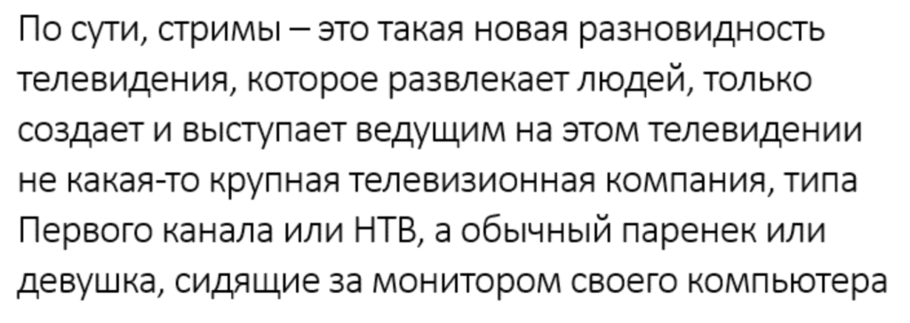 Чтобы понять, что такое стрим, просто проведите параллель с телевидением. Все мы знаем, что такое прямой эфир по телевидению или радио. Это когда невозможно что-либо вырезать и смонтировать. В том числе пошлость и неловкие ситуации.