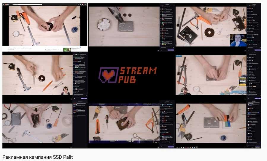 Пример рекламной интеграции на YouTube – кампания производителей жестких дисков SSD Palit. Основная идея – показать несовершенство старых дисков по сравнению с новыми SSD картами Palit. Для этого было создано 9 роликов в стиле «Очумелые ручки», в которых мастер создает интересный объект из жесткого диска. Стример включал ролик в прямом эфире.