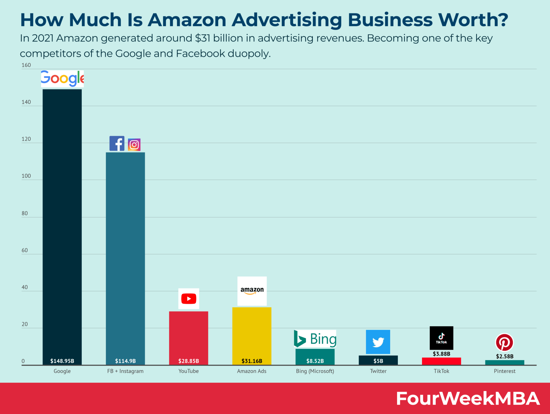 In 2021 Amazon generated around $31 billion in advertising revenues. Becoming one of the key competitors of the Google and Facebook duopoly.