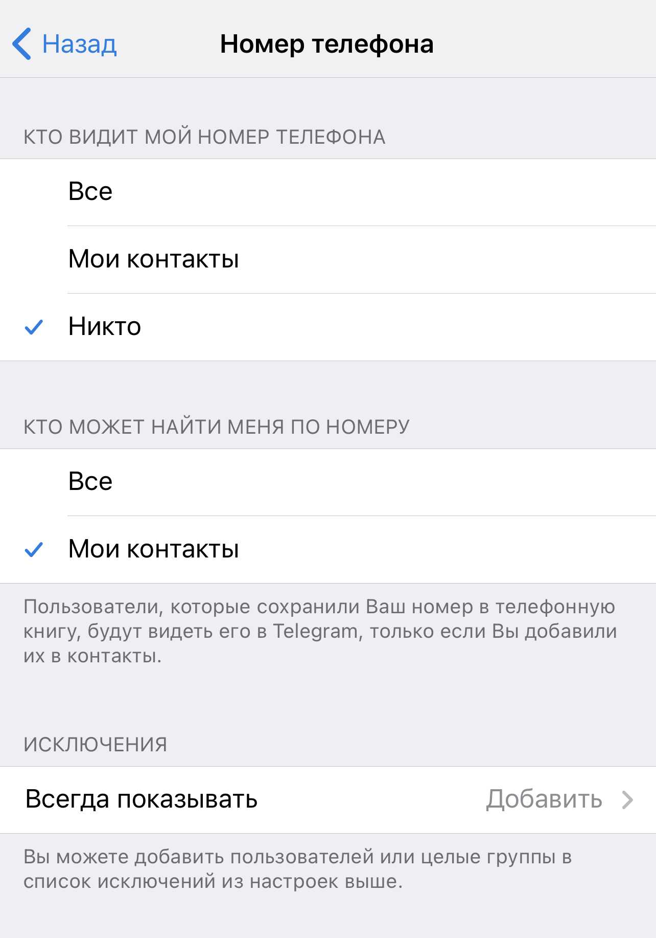 Скрыть номер в Телеграм можно в разделе настроек «Конфиденциальность» – «Номер телефона». Укажите, кто будет видеть телефон: все, никто или только ваши контакты. В этом же разделе предлагают отключить возможность найти вас по номеру и настроить исключения для определенных людей из списка контактов.