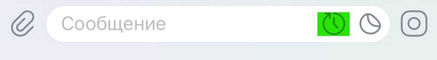 Чтобы найти вкладку с сообщениями «Отложенная отправка», нажмите в соответствующем чате на символ часов, который появился в поле ввода текста: