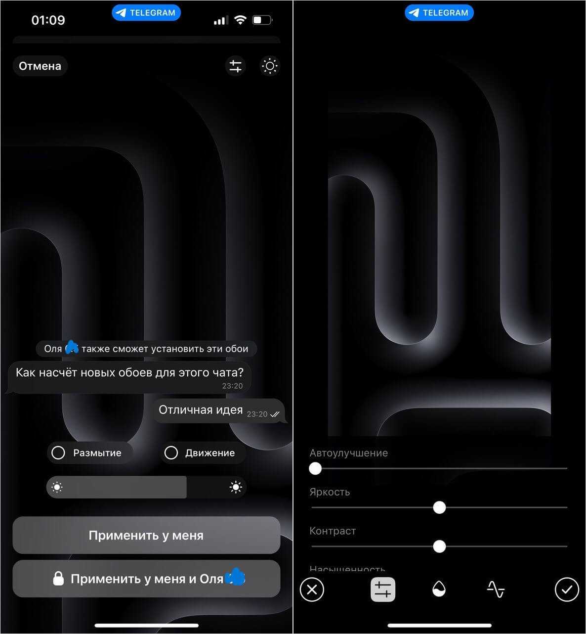 Заметили, что в разных чатах разные обои? Это не баг, а новая функция, позволяющая сменить оформление в Телеграм, нажав в профиле «Еще» — «Изменить обои». Там же можно их подкорректировать или ограничиться сменой темы или переключить оформление с темного на светлое.