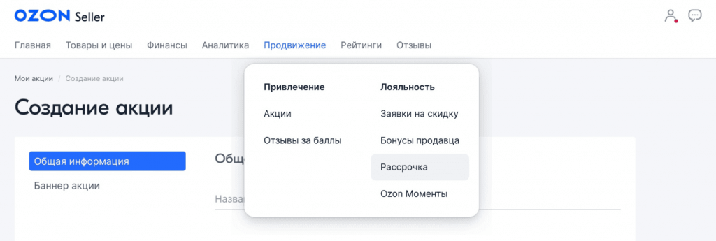 Шаг 1. Перейти в раздел «Продвижение» → «Рассрочка».