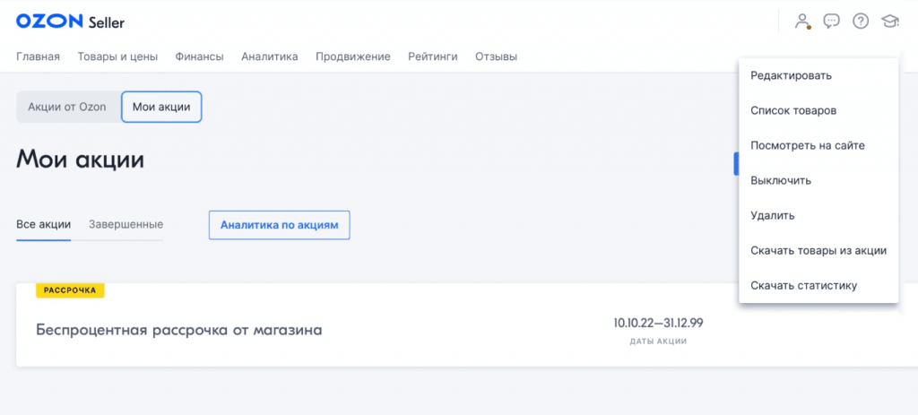 В дополнительном меню есть полезные кнопки «Скачать товары из акции» и «Скачать статистику» — с их помощью можно выгрузить список товаров, которые участвуют в акции, и посмотреть статистику продаж.