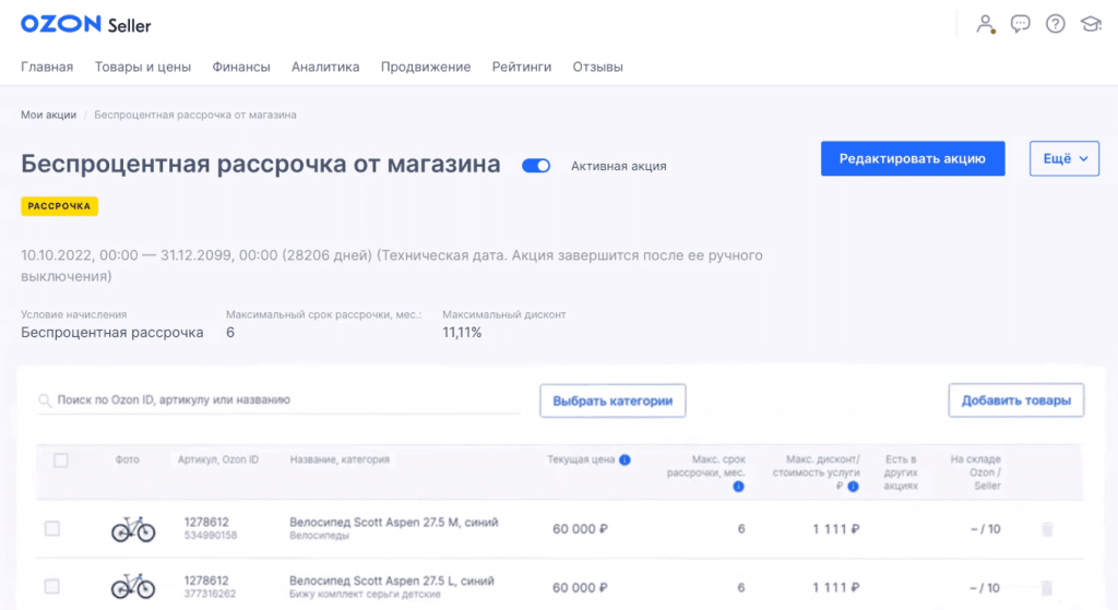 На странице акции можно добавлять и удалять товары, на которые будет действовать рассрочка. А если нажать «Еще» и выбрать «Посмотреть на сайте», откроется каталог маркетплейса с этими товарами.