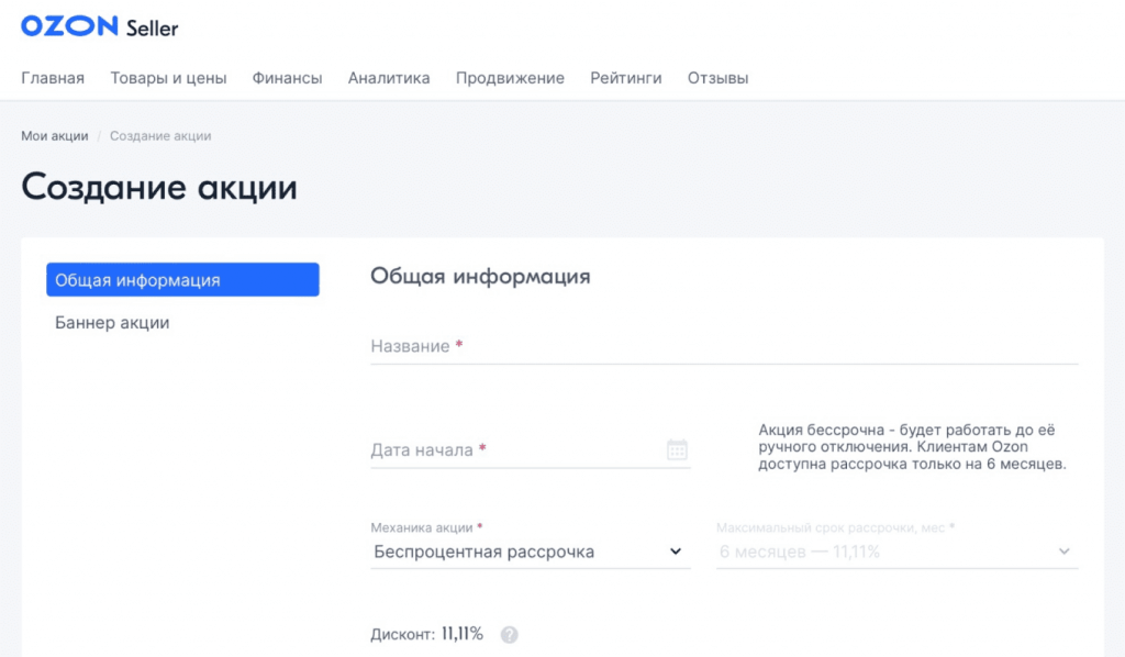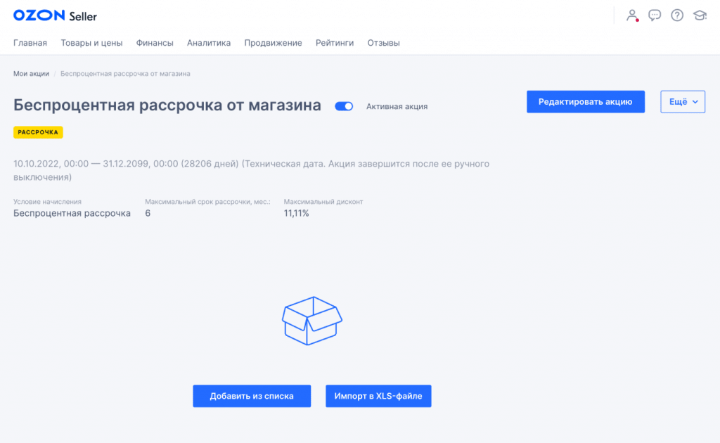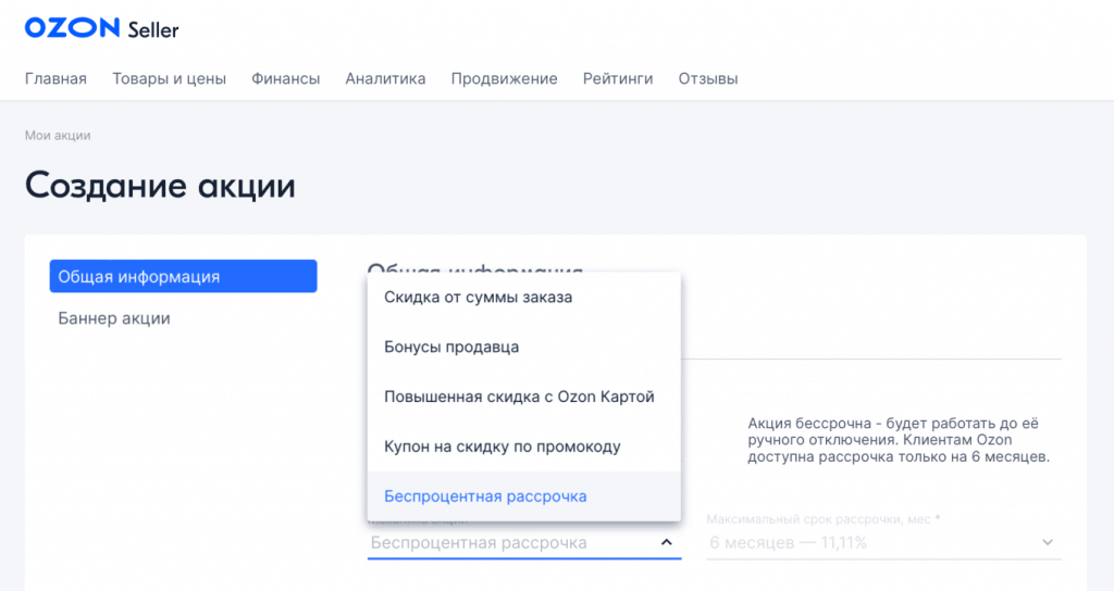 Рассрочка находится в разделе «Продвижение», потому что может использоваться как инструмент продвижения товаров наравне с «Бонусами продавца» или «Отзывами за баллы».