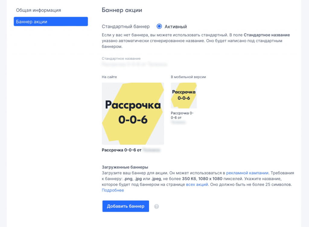 Все товары, которые можно купить в рассрочку, имеют стандартный баннер «Рассрочка 0—0—6». Если вы хотите, чтобы ваши товары особенно выделялись, можете загрузить свой баннер.