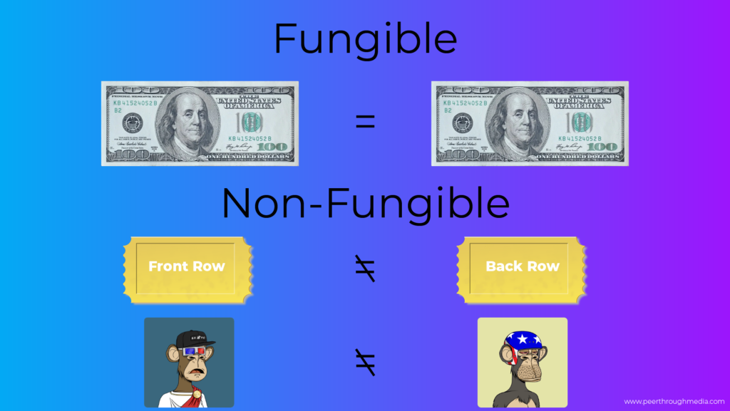 So, fungible tokens, like Eth or a US Dollars, are interchangeable in the sense that you don’t care which dollar bill you have. Most people have no problem trading an ETH for an ETH.