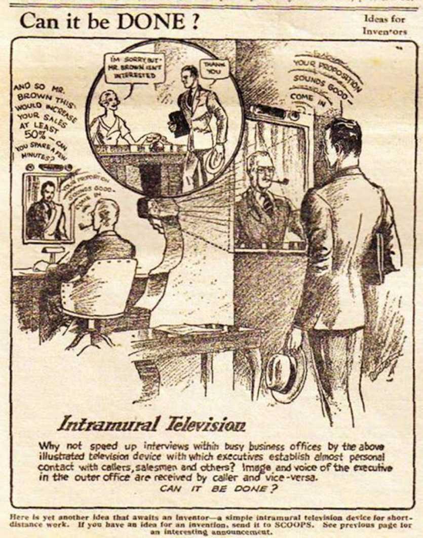 Подпись этого напичканного примерами коллажа из того же журнала Scoops Magazine (UK) предлагает создать «очное телевидение». С помощью него менеджеры высокого звена будут экономить время и вместо реальных встреч использовать видеосвязь с подчинёнными.