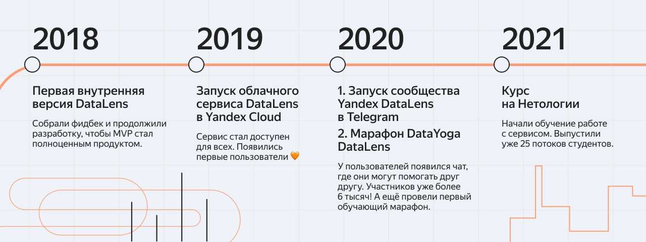 Со старта проекта мы развивали BI‑экспертизу среди пользователей: чем больше людей понимают, как с DataLens решать свои задачи, тем больше интересных сценариев — это двигает вперёд как сам проект, так и индустрию в целом. Для этого мы запустили несколько образовательных инициатив: провели BI‑марафон Data Yoga, несколько хакатонов, создали курсы по анализу данных на Нетологии и на Яндекс Практикуме и многое другое. Благодаря этому с 2020 года сообщество DataLens растёт: сейчас там больше 6500 человек.