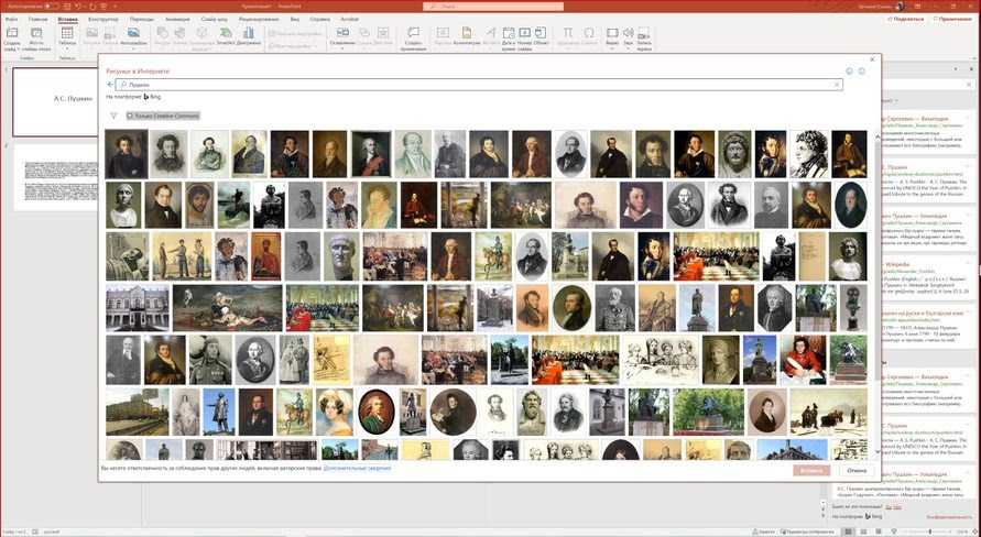 Любой презентации нужны изображения. Первый вариант: ищем Пушкина в интернете, сохраняем и вставляем в презентацию. Второй — находим нужную картинку, не сворачивая программу.