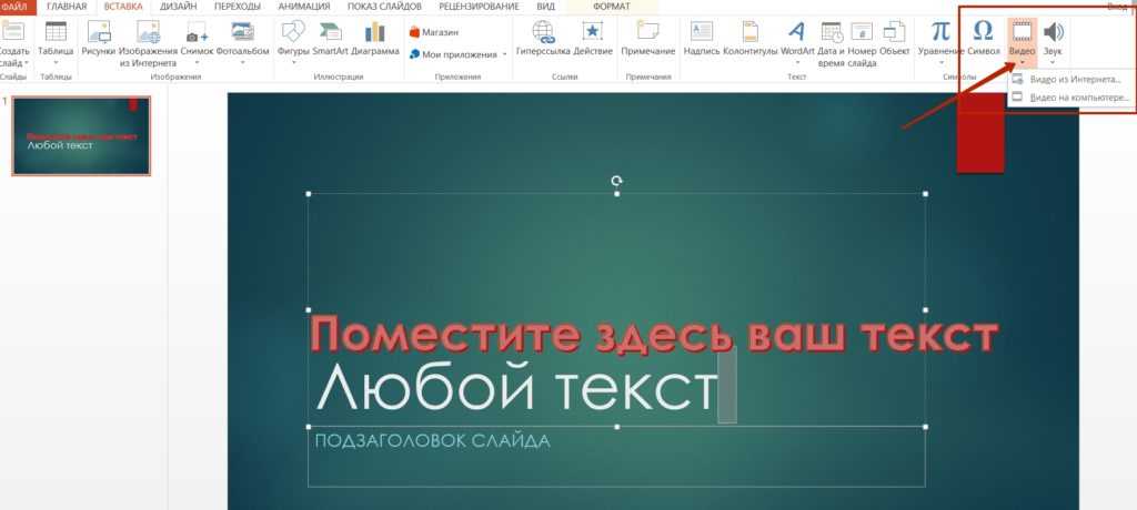 Вы можете снабдить презентацию видео- или аудио-файлом. Необходимо, чтобы файл был сохранен на компьютер. Добавлять их нужно, как и изображения: во вкладке «Вставка», выбрав «Фильм» («Видео») или «Звук».
