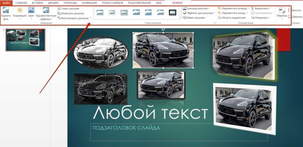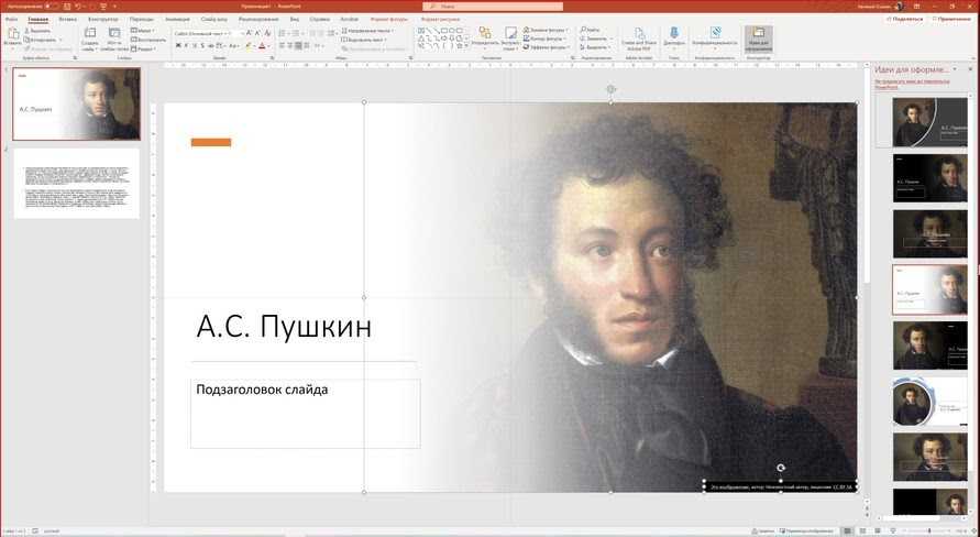 Если у вас есть подписка Microsoft 365 и доступ в интернет, можно перейти в раздел «Конструктор» и нажать на «Идеи для оформления». Нажимаем на понравившееся оформление, и изображение разместится согласно одному из шаблонов.