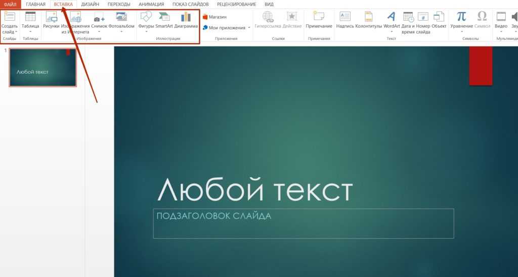 Для начала подготовьте слайд, выбрав нужный макет. Некоторые поля в макете можно удалять, а вместо них добавлять новые – это можно сделать во вкладке «Вставка». Перед вами откроются варианты для добавления таких элементов, как: