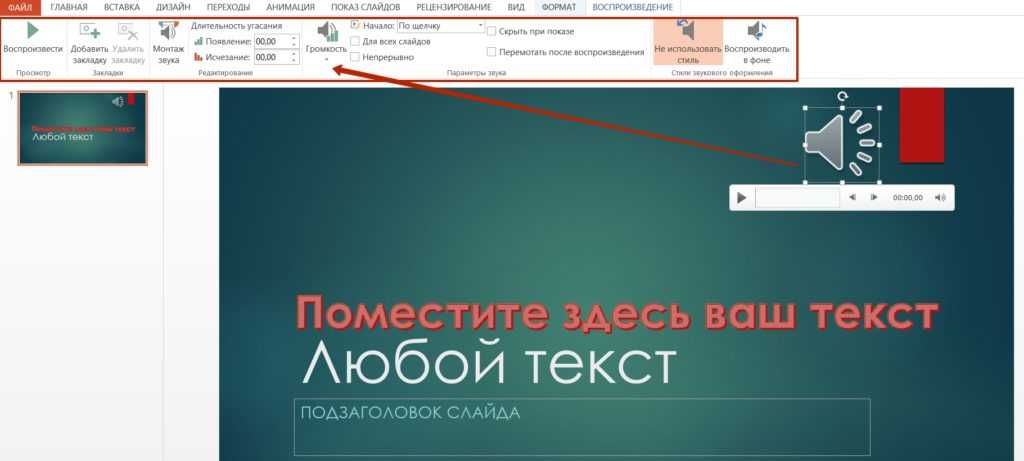 После добавления видео его можно, как и изображение, перетащить в нужное место слайда и указать габариты окна – ширину и высоту. С помощью специальных кнопок вы можете задать нужную громкость при воспроизведении.