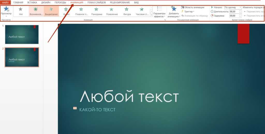 Другой интересный инструмент – это анимация. В отличие от перехода, она применяется не к самому слайду, а к его элементам: тексту, картинкам, графикам и т. д. Вы можете сделать разные эффекты, но не стоит слишком этим увлекаться: это может отвлечь ваших слушателей от содержания презентации.