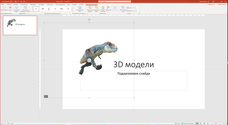 В презентацию можно добавить значки и даже 3D-модели. Делаем это с помощью соответствующей кнопки на вкладке «Вставка». Значки существуют в SVG-формате, поэтому их размер и цвет можно менять.