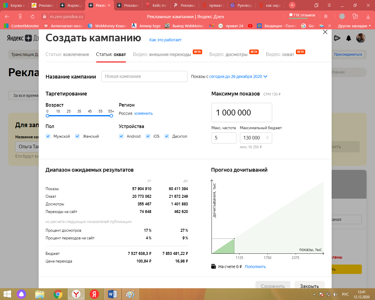 Создавая кампанию с целью «Охвата», вы максимально расширяете аудиторию. Так, при бюджете 30 тыс. руб. 150 тыс. пользователей увидят вашу карточку. Но это не значит, что все они перейдут дальше и захотят ознакомиться с вашим материалом.