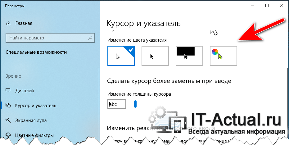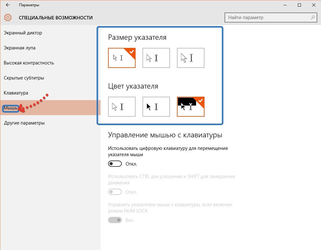 Изменение курсора мыши: размера и цвета используя «Настройки»