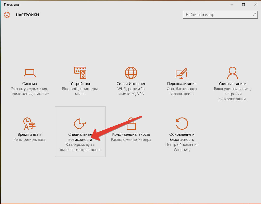 Самым быстрым способом открытия окна Настройки будет комбинация клавиш Win + Ш (Win + I) или воспользовавшись кнопкой Пуск . Читать: «Как открыть настройки в Windows 10?». После появления нужного окна необходимо нажать на Специальные возможности .