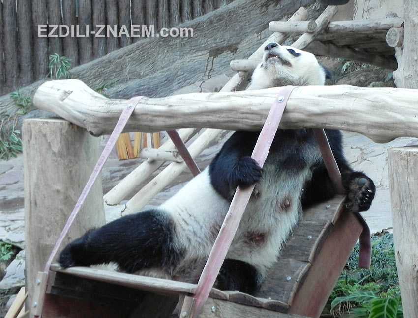 Сначала панда, элегантно держа пучки лапой, мастерски пережевывает зеленые побеги бамбука. Чтобы было удобно, для панды сделан специальный шезлонг со спинкой. Это ее рабочее место.