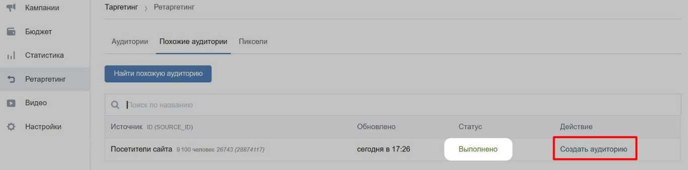 Когда база будет собрана, рядом с ней появится надпись «Выполнено». Вам останется лишь нажать кнопку «Создать аудиторию» и указать желаемый охват.