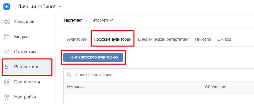 Чтобы собрать look-alike, откройте кабинет ВК и зайдите в раздел «Ретаргетинг». Выберите блок «Похожие аудитории» и нажмите «Найти».