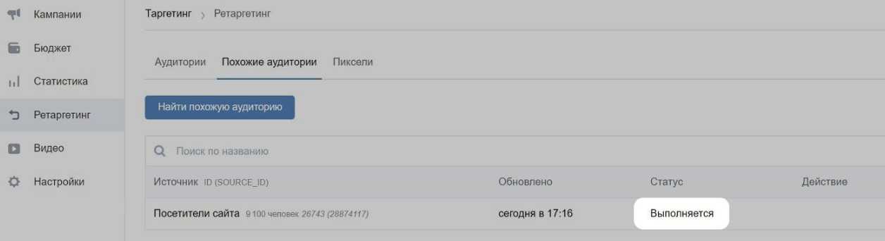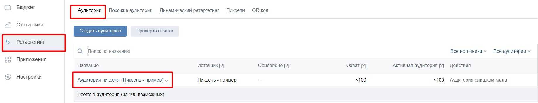 После создания пикселя новая аудитория автоматически появится в соответствующем разделе ретаргетинга.