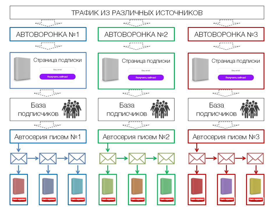Либо вы отправляете мгновенные письма, например, человек подписался на Воронку-1, и, после того, как он прошел автоматическую серию, вы его отправляете на Воронку-2, потом на Воронку-3, или наоборот. То есть у вас есть разные точки входа.