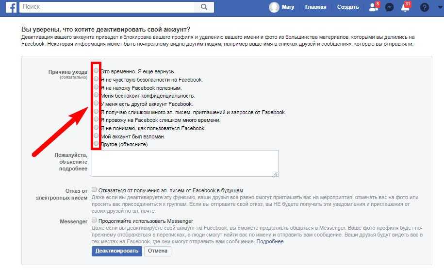 указываем причину своего ухода из данной социальной сети, для этого ставим напротив верного варианта пометку. Дополнительно вам будет предложено описать подробнее причину того, что вы решили временно попрощаться с Фейсбуком. Заполнять данную графу необязательно, по желанию;