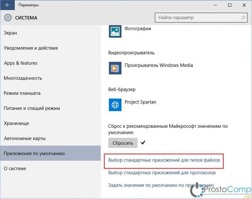Заходим в меню «Пуск» и открываем Параметры системы. В следующем окошке выбираем Систему и переходим на вкладку «Приложения по умолчанию». Тут предусмотрена кнопка сброса настроек. Она может пригодиться в случае если приложения, которые были выбраны как основные, работают не корректно, или не могут работать с нужными файлами. Нажав на нее, можно вернуть все настройки в первоначальный вид.