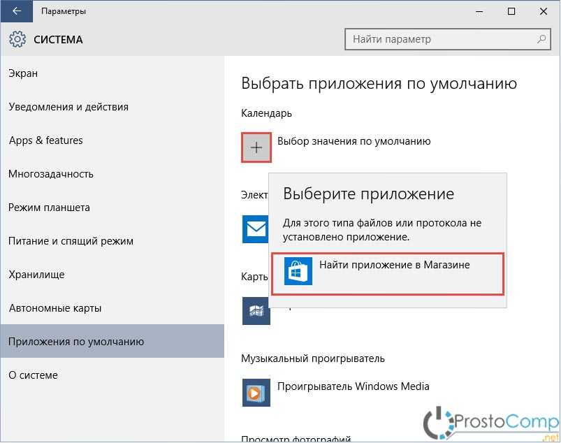 А вот когда для подходящих файлов не выбрано никакой программы, можно выбрать стандартное значение, система сама выберет соответствующее приложение. Если этого не случится и на компьютере не окажется нужной программы, то появится сообщение с предложением открыть Магазин, и там выполнить поиск и установку нужного приложения.