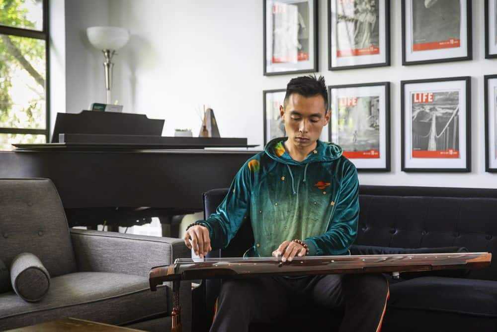 Джастин Чжу играет на традиционном китайском инструменте у себя дома. Фото Bloomberg