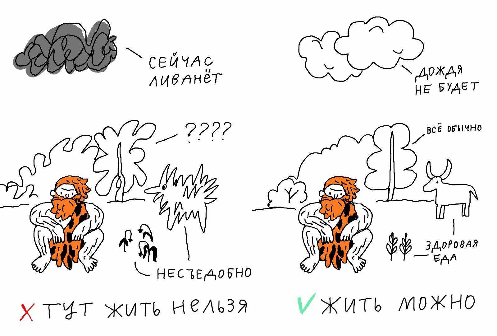Для выживания древнему человеку нужно правильно считывать сигналы природы. Он должен заметить, что всё испорченное будет иметь невнятную форму и цвет, а всё свежее и питательное будет симметричным и приятного цвета.