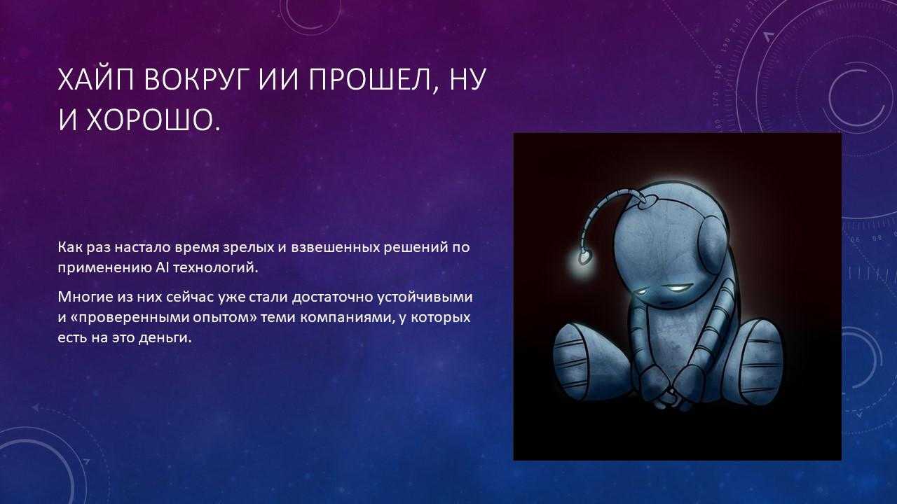 Хайп вокруг ИИ уже прошёл, инвесторы уже не кидаются с горящими глазами на стартапы в области ИИ, а ИТ-директора уже не стремятся внедрять всё, что с ним связано.